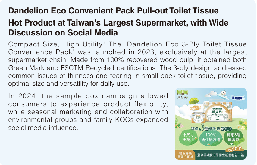 To expand the eco household paper market and support the Green Lifestyle policy, Dandelion launched convenient pack eco toilet tissue exclusively at PX Mart in 2023 and developed a 3-ply large pack with 20% more sheets for Carrefour to increase green product accessibility. In 2024, updated carbon footprint packaging was introduced to strengthen communication on CLC's sustainability initiatives. That year, Dandelion series sales exceeded 38 million packs, with annual growth of 10.83% and steadily increasing market penetration.