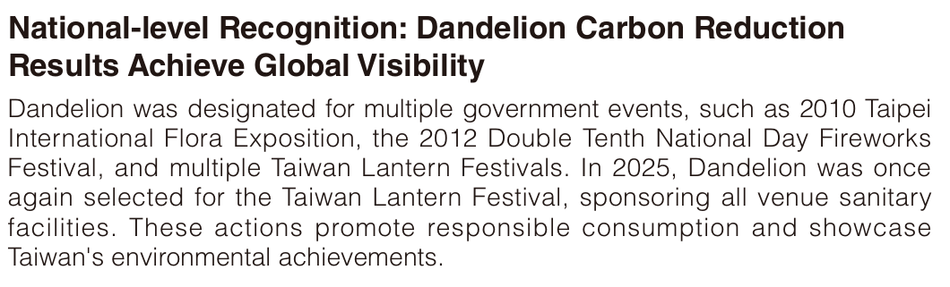 To strengthen face-to-face engagement with consumers, the company partnered with Carrefour stores to hold the Dandelion Environmental Agent Academy, providing interactive experiences to promote green consumption and sustainability among children. In addition, Dandelion and Michelin selected restaurants launched the "Let's Reduce Carbon for a Better Tomorrow" initiative to promote sustainable dining, supported by an invoice registration campaign to advance the Green Lifestyle—Green Dining approach.