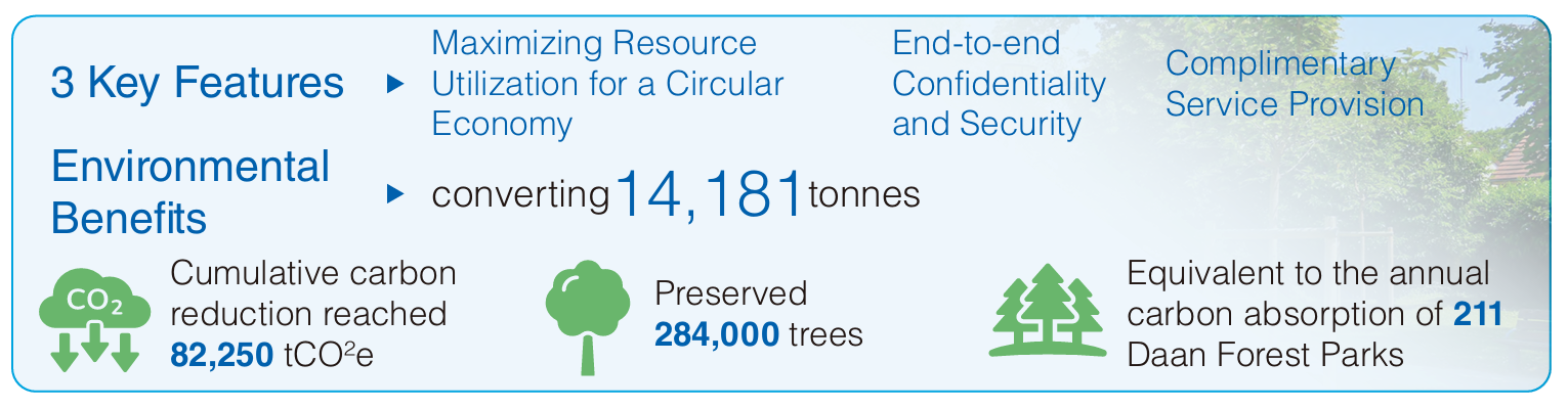 Since 2013, CLC has utilized existing pulp dispersion equipment to provide free confidential document destruction services. Over 12 years, CLC assisted nearly 400 partners—including government agencies, listed companies, financial and insurance firms, and defense units—by converting 14,181 tonnes of confidential documents into over 61.26 million packs of eco toilet tissue, demonstrating both environmental and economic benefits.