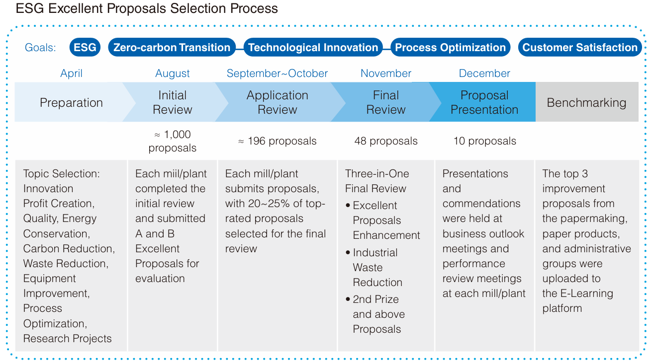 In 2024, over 1,000 proposals were submitted, with 48 Excellent Proposals shortlisted for the finals: 10 from Administration, 18 from Papermaking, and 20 from Paper Products. The expected profit was nearly NTD 170 million, with measurable improvements in production efficiency, sales quality, carbon reduction, service innovation, and work efficiency.