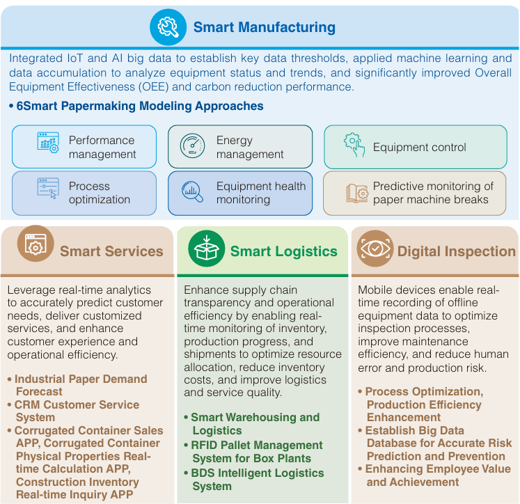 CLC Smart Papermaking 4.0 centers on Smart Manufacturing to enhance production efficiency and energy management, achieving low-carbon and green production. By applying AI, big data, cloud computing, IoT, and 5G, CLC strengthens knowledge transfer and early warning management, optimizes processes, and increases operational efficiency, delivering both service upgrades and carbon reduction.