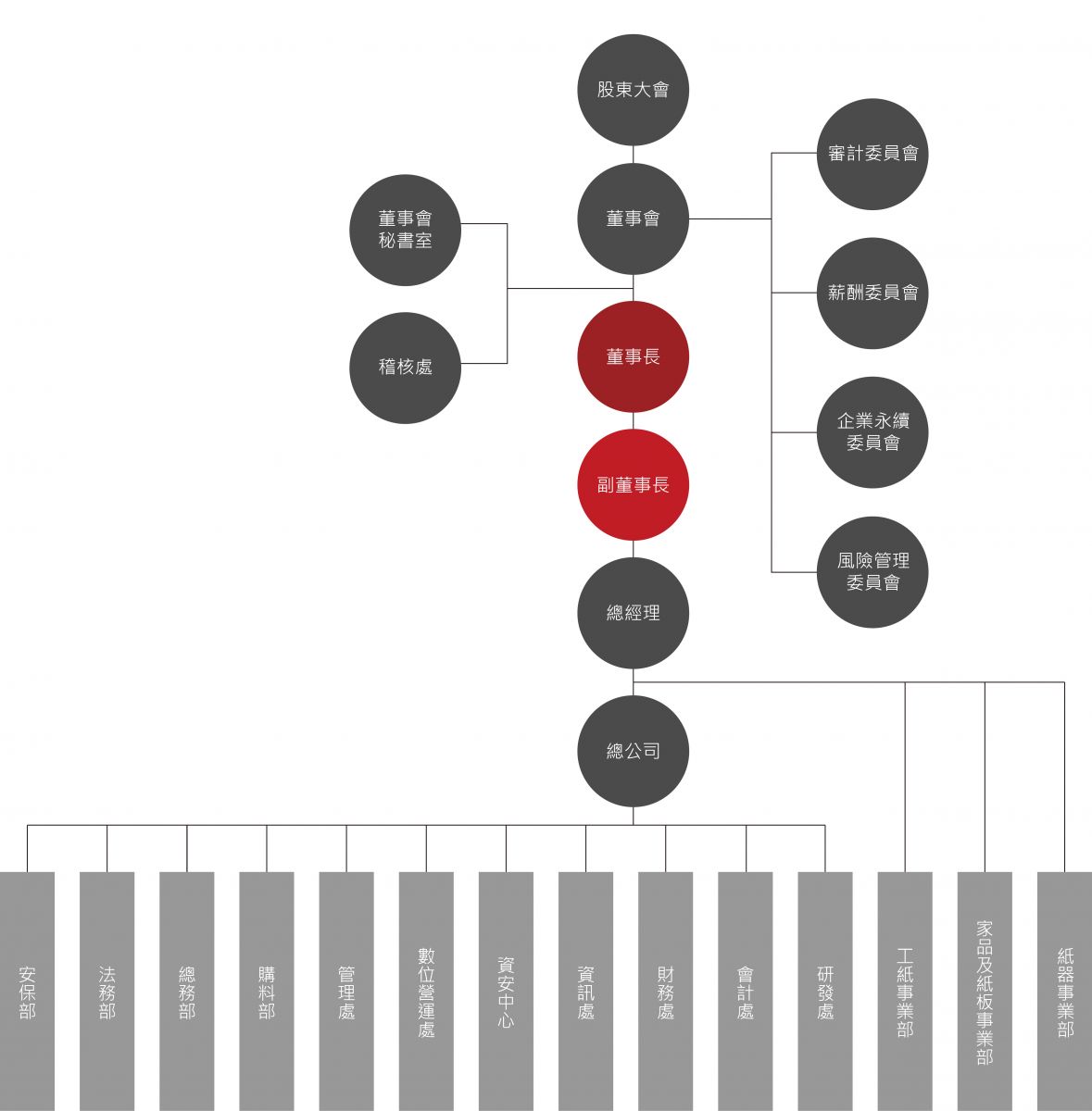 總公司設有管理處、資訊處、財務處、會計處、研發處,並於董事會下設稽核處,是全公司品質、產銷、行政、技術及全球運籌與子公司治理等業務管理中心。