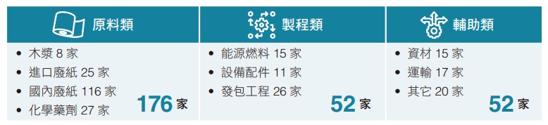 本調查於2024年11月15日至2025年1月15日期間執行,針對原料類與製程類(國外:木漿、廢紙、燃料;國內:化學品、設備)之44家關鍵一階供應商,進行兩大碳盤查主題(組織溫室氣體排放、產品碳足跡)之調查。