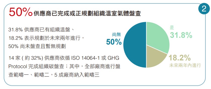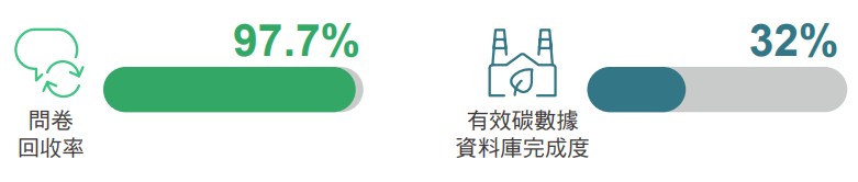 此次調查獲得供應商積極響應,問卷回收率高達97.7%(43家),且有14家(約32%)廠商表示已完成組織碳盤查,正隆在調查啟動首年即取得超過30%有效碳數據資料
