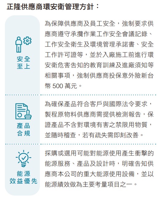 正隆秉持嚴謹、公平、公開的交易原則,嚴格遵循法規與社會規範,並積極開發優質供應商、外包商及第二來源,以確保供應鏈穩定與競爭力。公司依據相關評核辦法進行供應商調查與評鑑,並訂定「供應商分級管理制度」,確保供應來源符合品質、交期、價格及售後服務等核心要素,若供應商發生重大異動,將即刻啟動重新調查,以降低潛在風險。所有正隆合作的主要供應商及新增合作夥伴,皆須簽署《供應商行為準則》,涵蓋健康安全、勞動條件、環境保護、節能減碳、能源效益及禁用物質等關鍵項目,以強化供應鏈的合規性與永續管理。