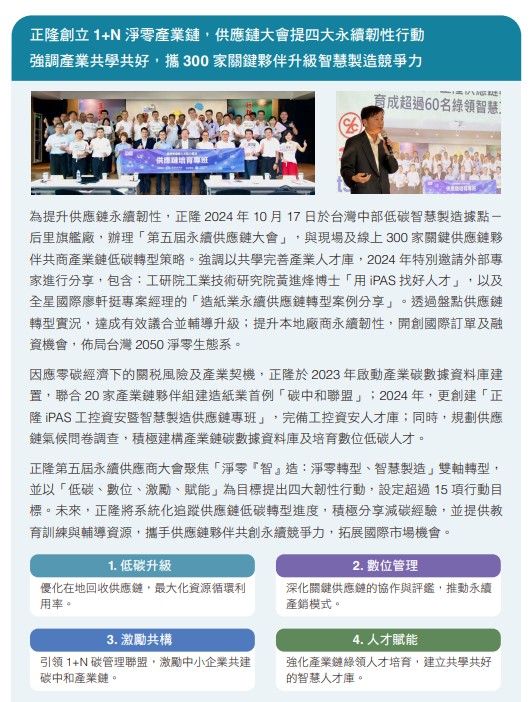 自2020年首創造紙業永續供應鏈大會以來,正隆於2024年已第五度舉辦,攜手300家關鍵供應商夥伴共商低碳轉型策略,推動產業永續發展。面對全球碳中和供應鏈趨勢,正隆於2023年領先業界組建造紙業首例碳中和聯盟,加速以正隆為核心的產業鏈低碳轉型。2024年更進一步開設「正隆iPAS工控資安暨智慧製造供應鏈專班」,強化紙業數位及風險管理韌性。為深化供應鏈永續管理,正隆持續擴大海外主要供應商的查核與評鑑,並於2024年針對關鍵一階供應商執行氣候問卷調查,盤點供應商低碳轉型現況,促進有效議合,並建構產業鏈碳數據資料庫,為實現淨零目標奠定堅實基礎。