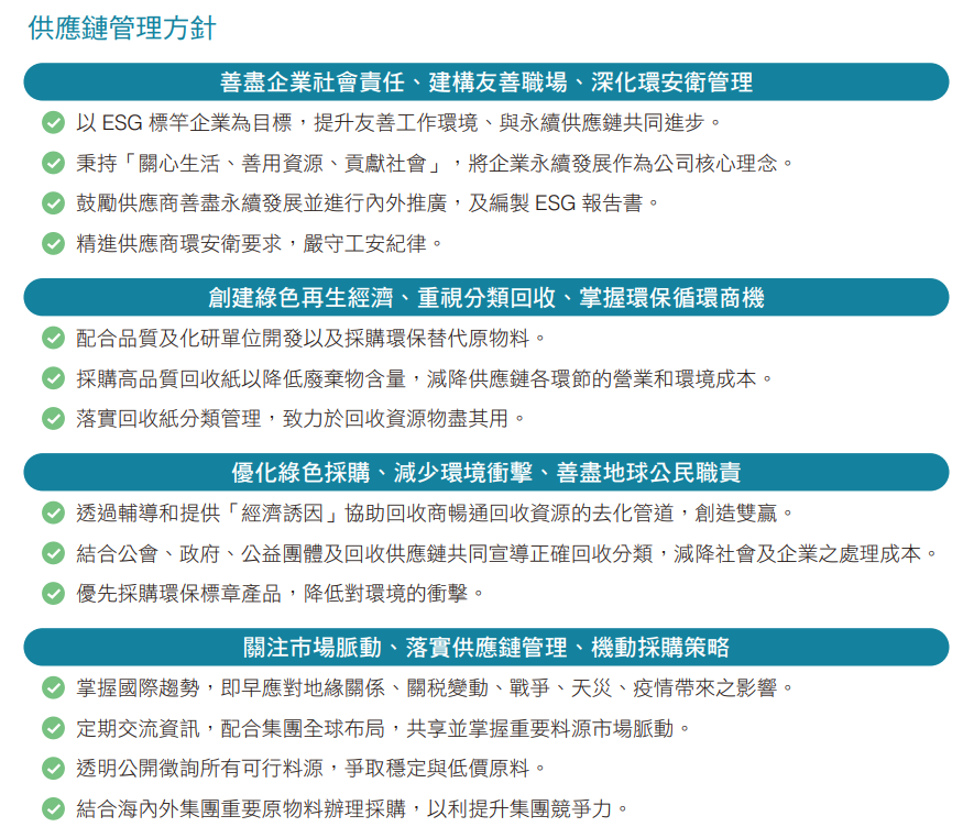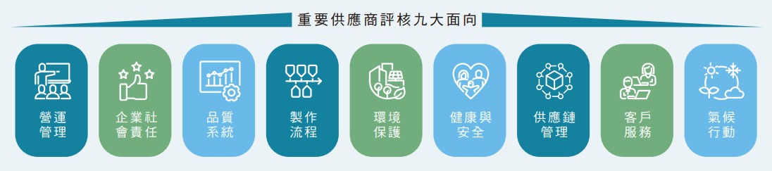 ● 策略:重視供應商永續發展與風險管理,制定短中期關鍵目標與具體行動方案,全面推動價值鏈永續升級。