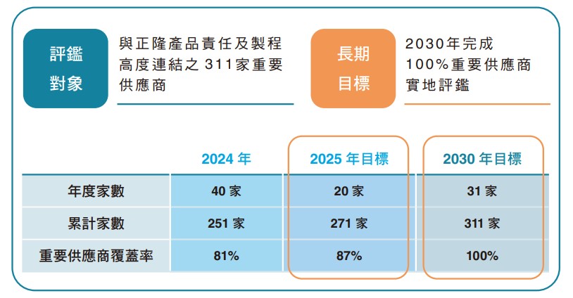2020年起,為強化供應鏈議合及管理,確保供應商維持穩定品質與供應能力,正隆針對與公司產品責任及製程高度連結的重要供應商,領先同業導入「實地評鑑」 制度,並訂定每年新增10%評鑑覆蓋率,目標於2030年達到100%之長期目標