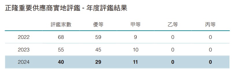 截至2024年,正隆累計完成251家供應商的實地評鑑,占2030年目標的81%,2024 年單一年度新增完成40家。2024年度評鑑結果顯示,優等供應商29家,甲等11家,乙等及丙等供應商均為0家。為持續強化供應鏈的永續韌性,正隆每年規劃並執行實地評鑑與現場查核作業,且根據產業趨勢與供應商運營狀況,持續優化評鑑指標。同時,對評鑑結果較低的供應商,公司會指派專人或委請專家進行輔導,協助其提升永續管理能力,以提升整體供應鏈韌性與永續競爭力。