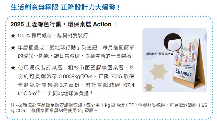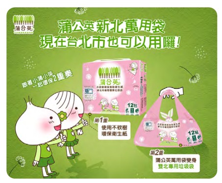 蒲公英環保家庭用紙是全國第一個取得環保標章、碳足跡、FSCTM Recycled三重綠色驗證的家用紙品牌,持續引領市場。為滿足消費者對綠色產品的需求,正隆進一步拓展環保產品線,推出副品牌「淨世代」,2024年環保系列產品總銷量已突破7,000萬包。此外,正隆亦率先推出「蒲公英環保萬用袋」,將外包裝與垃圾袋結合,創造減塑效益,上市以來累計銷售近120萬串,減塑達4.2萬公斤,貢獻減碳逾8.9萬公斤(註),體現品牌環保創新的實踐力。