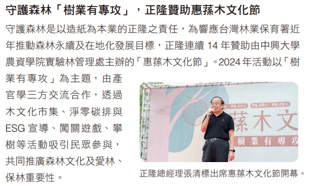 正隆呼應「自然永續,紙向淨零」的65周年目標,並響應聯合國全球塑膠公約草案,跨產業延伸自然為本理念,於2023年首度推出使用100%本地回收紙再生的環保抑草紙,且連兩年(2023~2024)取得農業部有機農業資材驗證。
