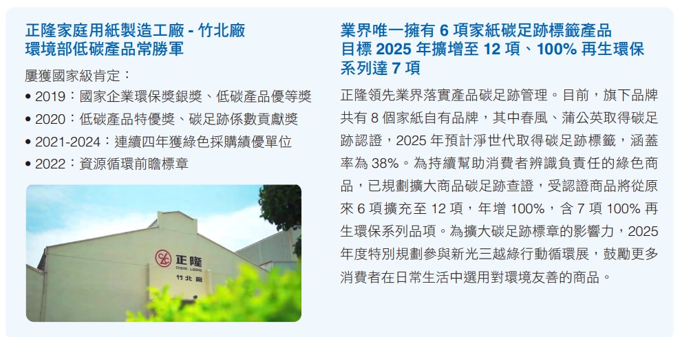 面對環境挑戰與市場變化,正隆秉持「Less is More」的理念,致力以最少的資源創造最大的產品價值,持續開發多元低碳產品,滿足全球對永續包裝與生活用品日益升高的需求,為邁向淨零未來貢獻一份力量。