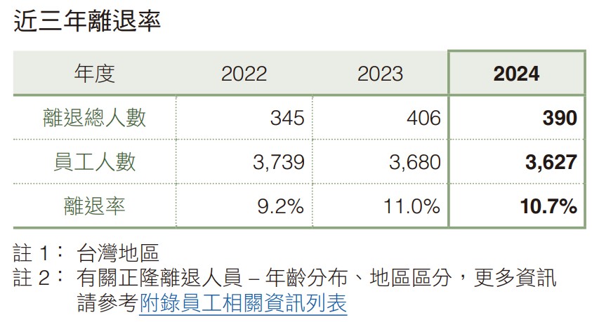 此外,為有效留才與降低離職衝擊,正隆於員工提出離職申請時,由直屬主管與人資單位主動進行面談,提供內部轉任機會與職涯建議,協助同仁發揮專長、適性發展,進一步強化組織穩定性與員工歸屬感。