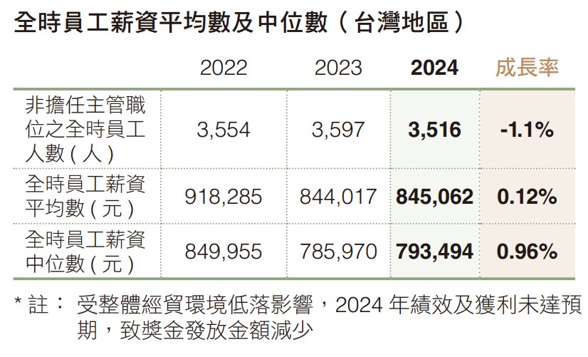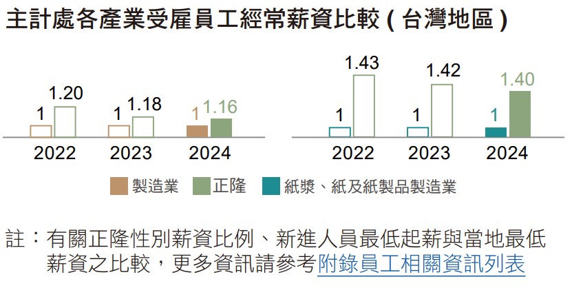正隆為吸引與留任優秀人才,提供優於業界、具競爭力的薪資待遇,基層人員起薪水準優於法定之最低工資,學士以上新進人員最低起薪優於法定起薪35%以上、碩士學位優於法定起薪53%以上。本公司致力於兩性平等、同工同酬,惟部分同職級男性同仁因年資普遍高於女性同仁,且現場男性員工加班時數較高,間接造成薪酬比例之差異。持續關注就業市場薪資水平,正隆每年檢討薪酬合理化,並視當年度營運績效進行調薪,已連續18年調升薪資,每年漲幅約1~3%,2024年調薪幅度達2%。非擔任主管全時員工薪資平均數約84.5萬元;中位數約79.3萬元。