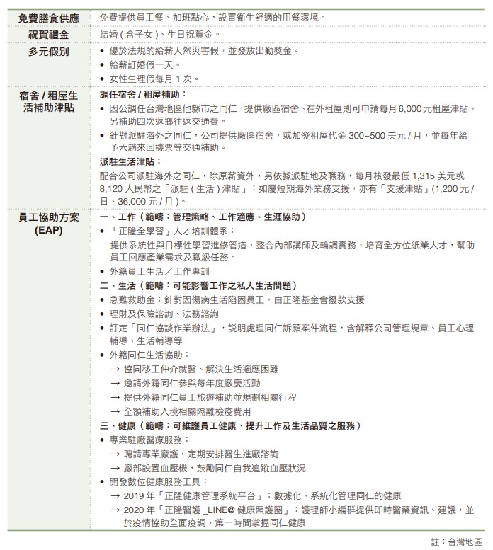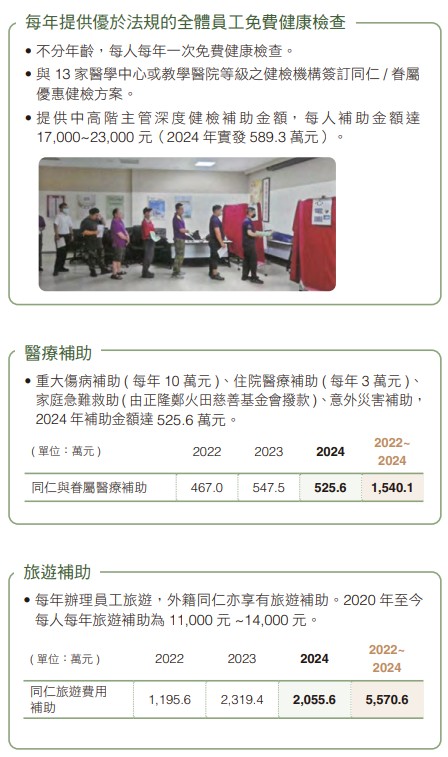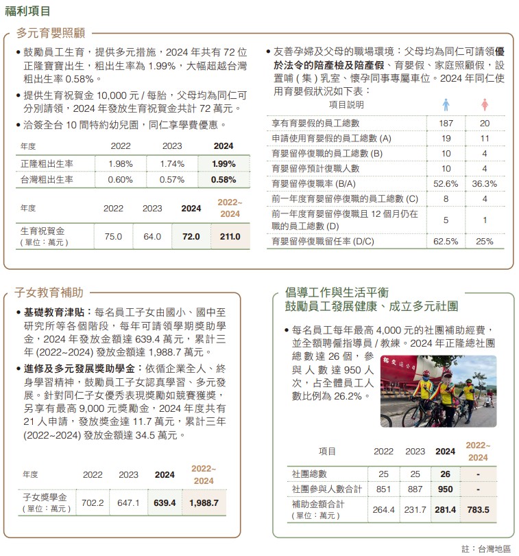 正隆致力於打造讓人才充分發揮的工作環境,並恪遵法規制定完整的員工政策,提供優於法令的福利,如健康檢查與多元假別,確保同仁獲得全方位照顧。此外,公司亦規劃多項措施關懷員工家庭生活,並透過福委會定期會議,持續推動多元共融的福利與關懷方案。2024年正隆每位員工福利支出約3.8萬元,正隆已連續五屆獲頒1111人力銀行「幸福企業-金獎」。