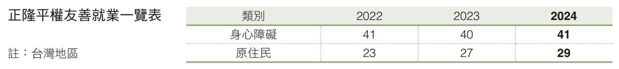 重視且保障弱勢及相關族群平等就業機會,正隆遵循「身心障礙者權益保障法」及「原住民族工作權保障法」規定,提供身心受限者合適工作機會。2024年台灣地區共聘僱41位身心受限員工,符合身心障礙者權益保障法進用規定,同時聘用29位原住民族同仁。促進多元任用,台灣廠區設置「原住民久任獎金」,2024年發放24人次,鼓勵原住民族群久任。正隆海內外員工組成以本國籍為主,並優先聘用當地員工,除創造地方就業機會,亦有助於人員穩定,受限於少數生產線無法順利招募本國籍員工,台灣廠區始引進外籍人員,確保產線順利運作。