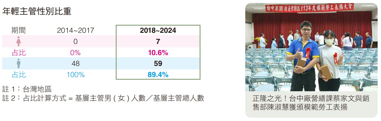 造紙產業屬傳統製造業,且因產業特性為24小時生產,現場基層主管如班組長多須執行現場輪班與巡視作業,長期形成男性為主的任用結構,女性基層主管比例偏低,男女約為12.2:1。此外,班組長雖屬基層職務,卻是邁向管理職涯的關鍵起點,過去晉升平均需歷經11年。正隆近年積極推動職場年輕化與性別平權,自2018年以來已有66位年資五年以下同仁晉升班組長,其中女性占比達10.6%,不僅打破晉升年資門檻,也逐步改善性別結構,實踐更具包容力的管理文化,展現正隆對多元職場的承諾與實踐。同時,正隆積極鼓勵外界肯定優秀人才,展現公司在人才培育與組織結構優化的持續投入與卓越成果。