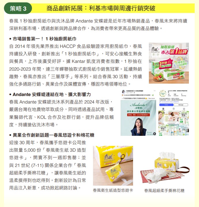 順應全球低碳減塑與自然為本解方趨勢,正隆於2024年推出「蒲公英環保便利包抽取衛生紙」與「Andante安蝶媞在地萃取潔顏系列」,以環保創新提升消費體驗。迎接2025年春風品牌成立30週年,將推出「盒裝面紙使用全紙材不裱膜」等創新產品,讓永續從日常開始,陪伴消費者輕鬆實踐環保生活,並持續強化永續特色,陪伴消費者邁向下一個30年。